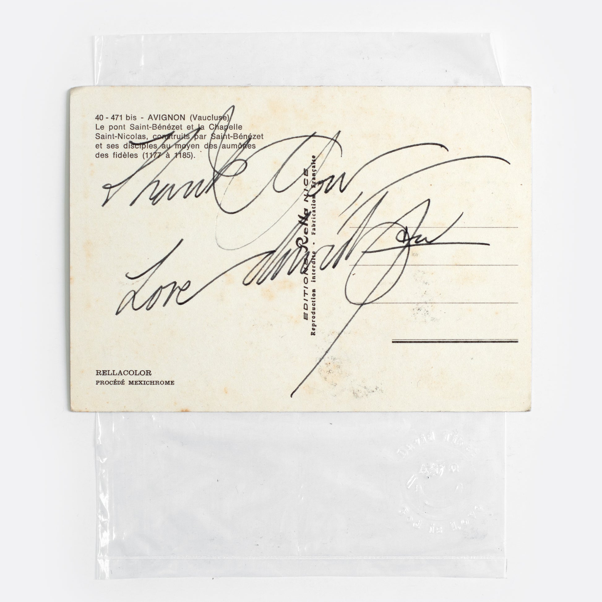 Rubber BELLA stamp on the front of postcard, signed in the bottom right-hand corner, and THANK YOU, LOVE DAVID on the back.